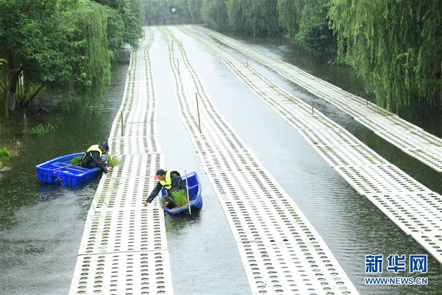 6月29日,工作人員在吳興區(qū)湖東街道的“水上稻田”插秧。今年以來,浙江湖州吳興區(qū)湖東街道開始在轄區(qū)河道大規(guī)模推廣“水上稻田”新型農(nóng)業(yè)項(xiàng)目,利用浮島進(jìn)行特種水稻種植,既能凈化水體,又能產(chǎn)出生態(tài)稻谷?!八系咎铩鳖A(yù)計(jì)在11月實(shí)現(xiàn)收割。新華社記者翁忻旸攝