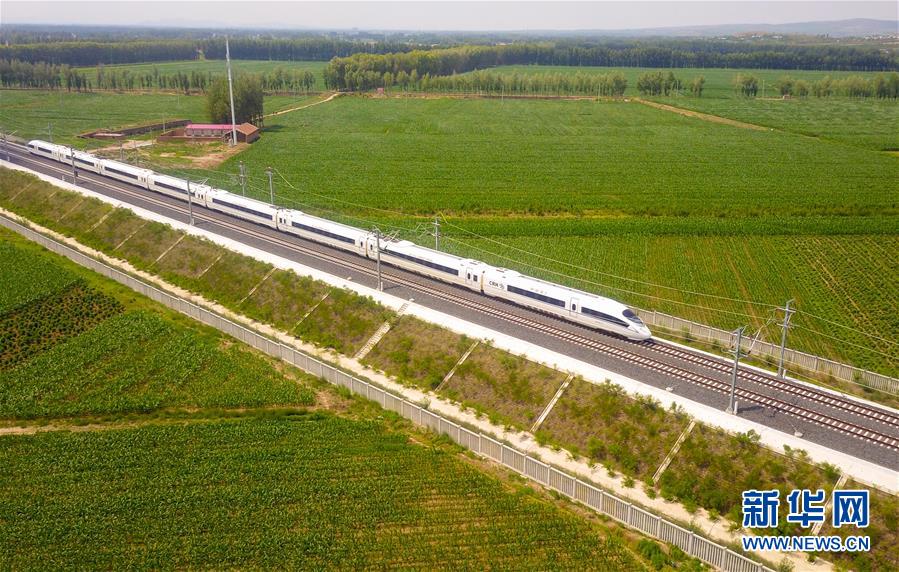 一列“和諧號”動車組列車行駛在內(nèi)蒙古赤峰市元寶山區(qū)的田野間(6月30日攝,無人機(jī)照片)。新華社記者彭源攝