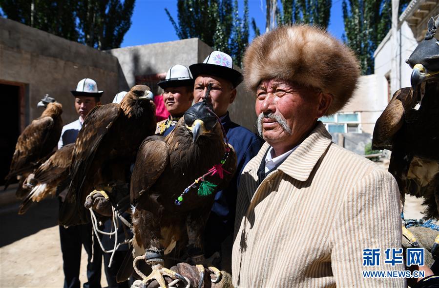 6月29日,庫爾馬西·胡特曼(右)和他的徒弟們展示獵鷹。新華社記者宋彥樺攝