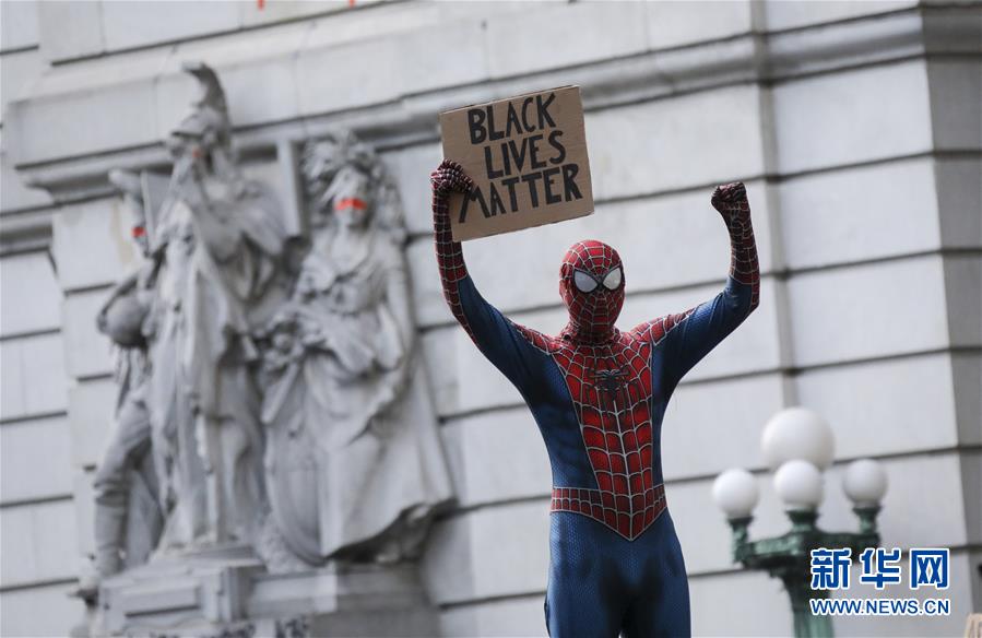 6月30日,一名打扮成“蜘蛛俠”的抗議者在美國(guó)紐約市政廳附近手舉寫(xiě)有“黑人的命也是命”的標(biāo)語(yǔ)。由美國(guó)明尼蘇達(dá)州明尼阿波利斯市非裔男子弗洛伊德遭白人警察暴力執(zhí)法而死一事引發(fā)的各種抗議活動(dòng)仍在紐約持續(xù)進(jìn)行。新華社記者王迎攝