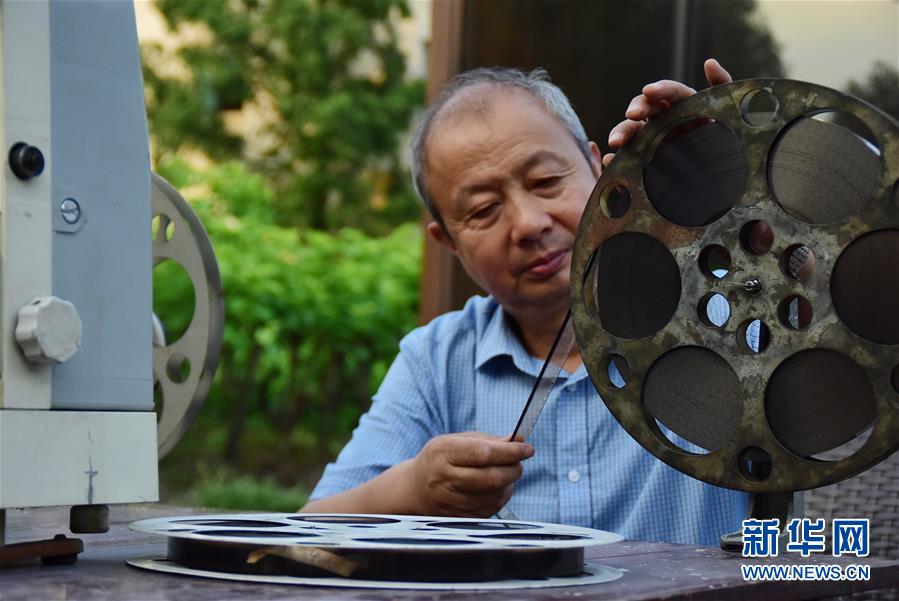 6月30日,朱生榮在當(dāng)晚電影開(kāi)播前將膠片調(diào)至起始幀。新華社記者鄭夢(mèng)雨攝