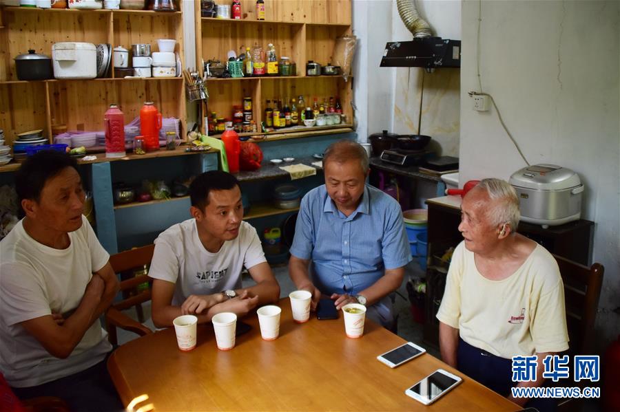 6月30日,第二代放映人朱文炳(左一)、第四代放映人朱強(qiáng)(左二)與第三代放映人朱生榮(右二)來(lái)看望第一代放映人王志華(右一)。新華社記者鄭夢(mèng)雨攝