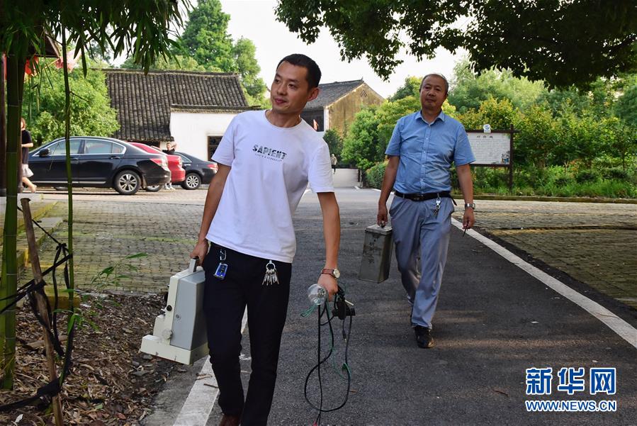 6月30日,朱生榮(右)和兒子朱強(qiáng)(左)攜帶放映設(shè)備來(lái)到馬鳴村將軍湖廣場(chǎng)。新華社記者鄭夢(mèng)雨攝