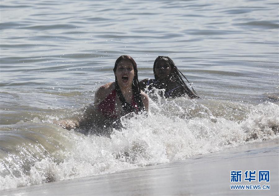 7月1日,人們在美國紐約科尼島戲水。當(dāng)日,美國紐約市屬八處海灘正式重新準(zhǔn)許民眾游泳,救生員也同時上崗。新華社記者王迎攝