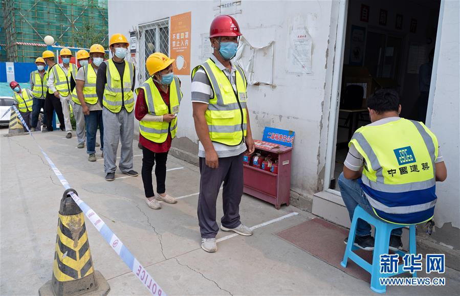 7月2日,在北京市大興區(qū)中建三局二公司北京公司一項(xiàng)目建筑工地的臨時(shí)核酸檢測采樣點(diǎn),建筑工地人員排隊(duì)等候采樣。