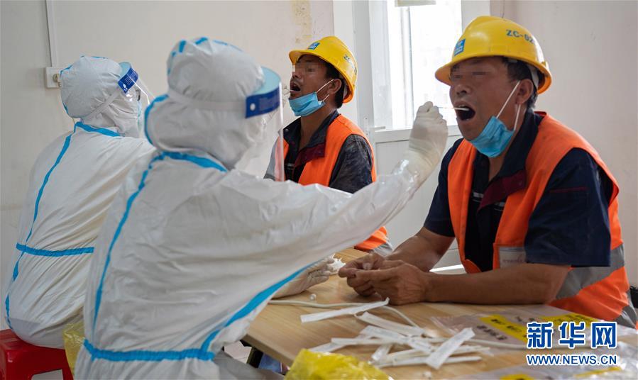 7月2日,在北京市大興區(qū)中建三局二公司北京公司一項(xiàng)目建筑工地的臨時核酸檢測采樣點(diǎn),醫(yī)護(hù)人員為建筑工地人員采集咽拭子。新華社記者才揚(yáng)攝