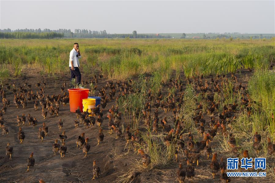7月1日,在黑龍江省五大連池市的草原上,桑慶軍吹響口哨召喚他的“雞部隊”。新華社記者謝劍飛攝