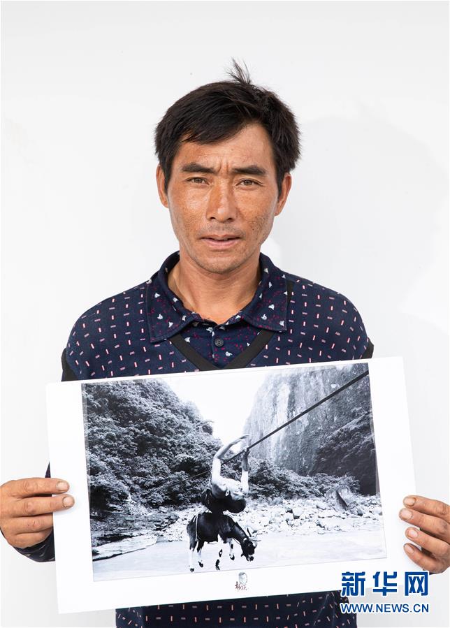 且沙次干手捧自己背羊過(guò)溜索的老照片在新居門前留影(6月30日攝)。新華社記者 江宏景 攝