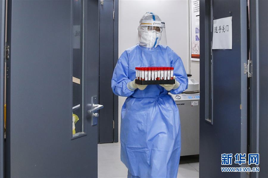 7月3日,中日友好醫(yī)院檢驗(yàn)科新冠核酸檢測(cè)實(shí)驗(yàn)室的檢驗(yàn)人員閆克芹運(yùn)送經(jīng)過滅活的樣本。新華社記者張玉薇攝