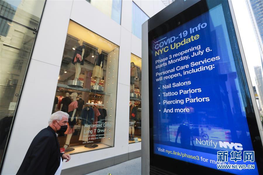7月4日,一名行人從美國紐約第五大道顯示新冠疫情最新情況的信息屏旁經(jīng)過。當(dāng)日是美國獨立日,美國多地疫情仍面臨嚴(yán)峻形勢。美國約翰斯·霍普金斯大學(xué)實時統(tǒng)計數(shù)據(jù)顯示,美國累計新冠確診病例4日已超過280萬例。新華社記者王迎攝