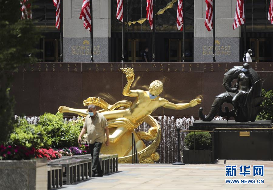 7月4日,一名男子從美國紐約洛克菲勒中心一尊戴口罩的雕像前走過。當(dāng)日是美國獨立日,美國多地疫情仍面臨嚴(yán)峻形勢。美國約翰斯·霍普金斯大學(xué)實時統(tǒng)計數(shù)據(jù)顯示,美國累計新冠確診病例4日已超過280萬例。新華社記者王迎攝