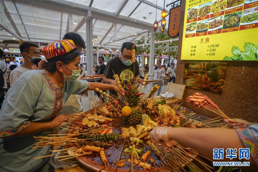 游客在烏魯木齊大巴扎景區(qū)挑選麻辣燙(7月4日攝)。夏日周末,烏魯木齊市大巴扎景區(qū)內(nèi)熙熙攘攘,人們來(lái)到這里品嘗美食、休閑購(gòu)物。2018年,經(jīng)過靚化改造后的大巴扎景區(qū)新增長(zhǎng)約800米的步行街,分為文創(chuàng)文旅和“非遺”項(xiàng)目街區(qū)、國(guó)際時(shí)尚街區(qū)和大巴扎美食街區(qū),是烏魯木齊最受歡迎的旅游目的地之一。新華社記者趙戈攝