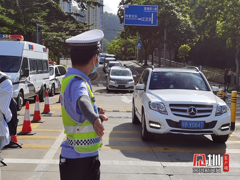 紅嶺中學(xué)考點(diǎn)門(mén)口正在指揮車輛通行的交警。