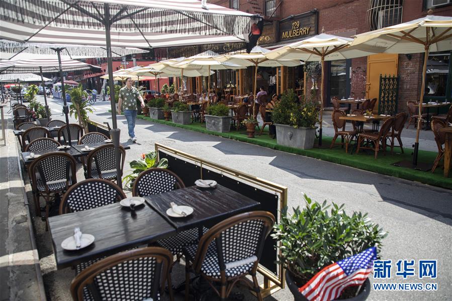 7月6日,一名男子從美國(guó)紐約一家餐廳的戶外餐區(qū)旁經(jīng)過。當(dāng)天,紐約進(jìn)入重啟第三階段,美甲店、按摩店等個(gè)人護(hù)理業(yè)在經(jīng)歷近4個(gè)月的停業(yè)后被允許重新開放。因防疫需要,原本應(yīng)在第三階段開放的餐飲業(yè)室內(nèi)就餐仍處于暫停狀態(tài)。新華社記者王迎攝