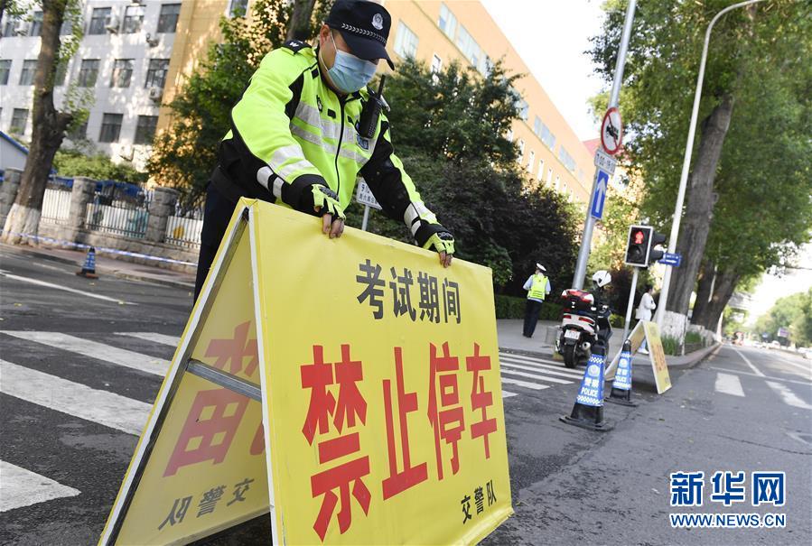 7月7日,在吉林省長春市的東北師范大學(xué)附屬中學(xué)考點(diǎn)外,執(zhí)勤交警在道路上架設(shè)提示牌。當(dāng)日,2020年高考拉開帷幕。新華社記者許暢攝