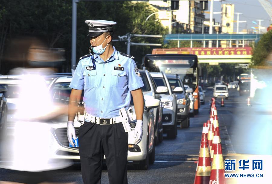 7月7日,在烏魯木齊市第六十八中學考點外,烏魯木齊市公安局交通警察支隊新市區(qū)大隊阿勒泰路中隊中隊長謝建明在引導考生通過馬路。當日,2020年高考拉開帷幕。新華社記者王菲攝