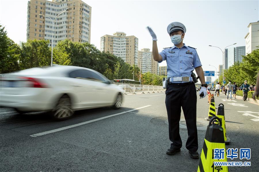 7月7日,在位于北京的中國人民大學附屬中學考點外,北京市公安局公安交通管理局海淀交通支隊中關村大隊交警付云輝在指揮車輛有序行駛。當日,2020年高考拉開帷幕。新華社記者沈伯韓攝