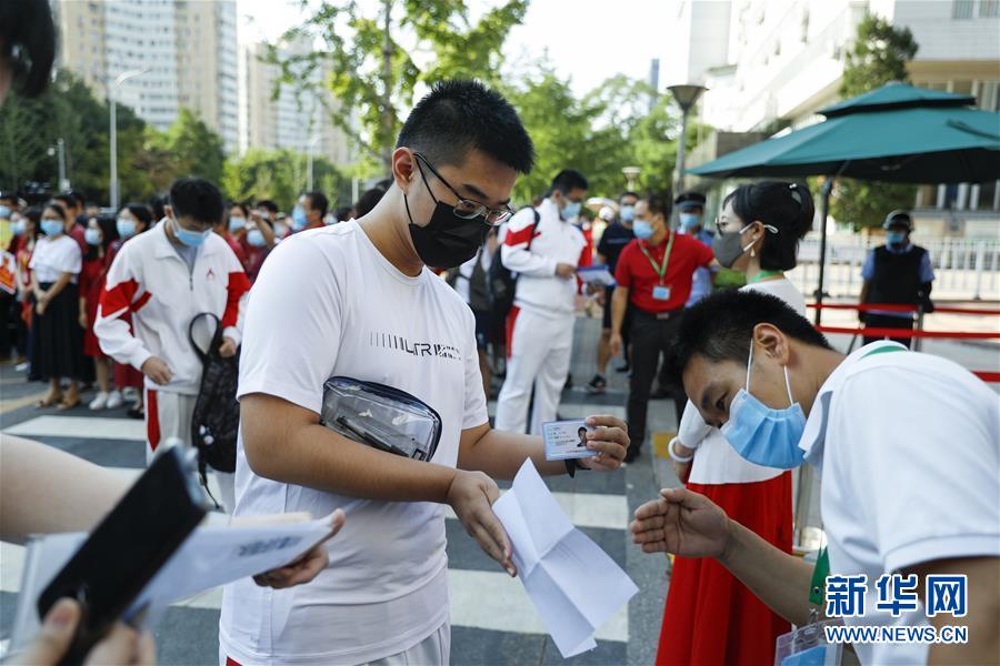 7月7日,在位于北京的中國人民大學附屬中學考點外,工作人員查驗考生準考證和身份證等證件信息。當日,2020年高考拉開帷幕。新華社記者沈伯韓攝