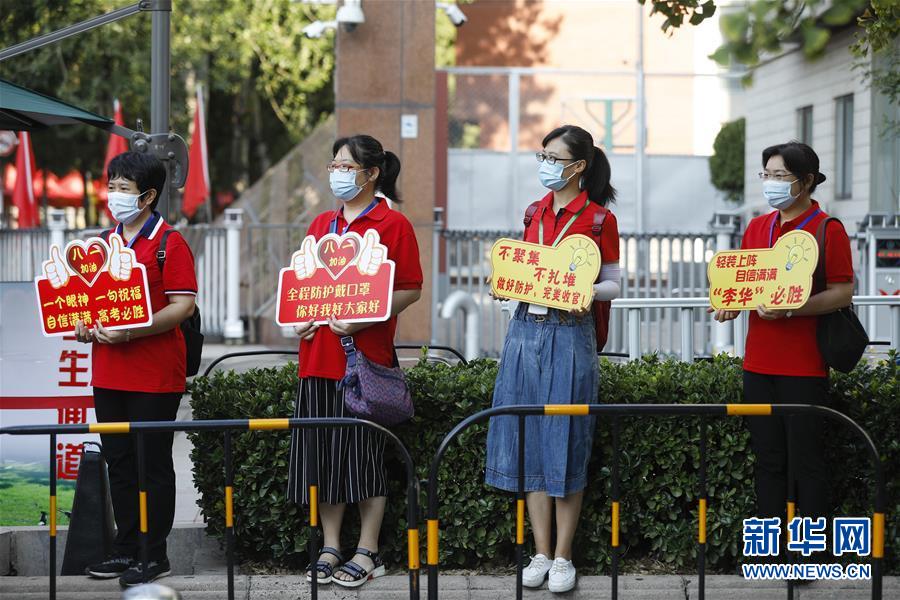 7月7日,在位于北京的中國人民大學附屬中學考點外,前來送考的老師舉著提示牌送考生進考場。當日,2020年高考拉開帷幕。新華社記者沈伯韓攝