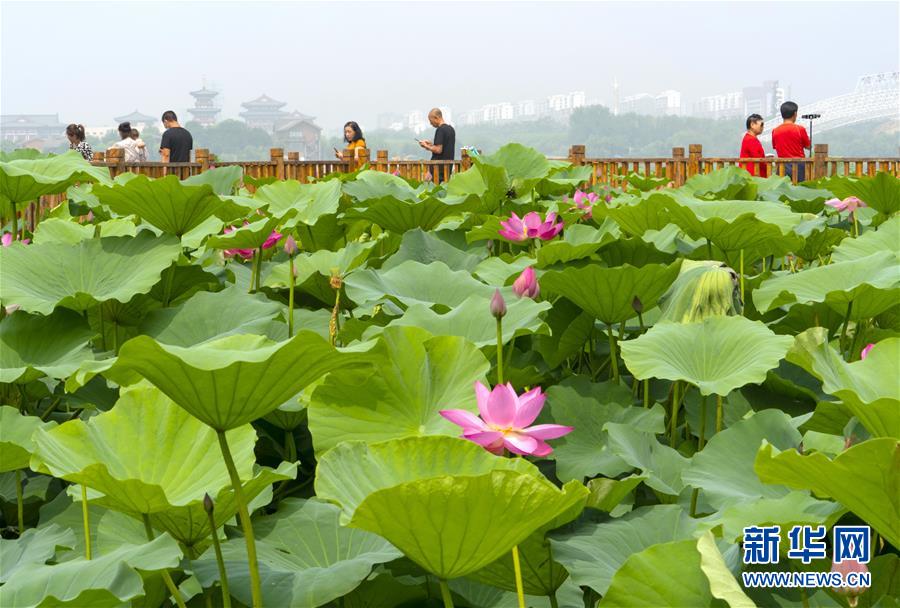 7月7日,游客在唐山市南湖公園欣賞盛開的荷花。近日,河北省唐山市南湖公園內荷花競相綻放,呈現(xiàn)出“接天蓮葉無窮碧,映日荷花別樣紅”的美麗景象,吸引了眾多游客前來觀賞。新華社記者楊世堯攝