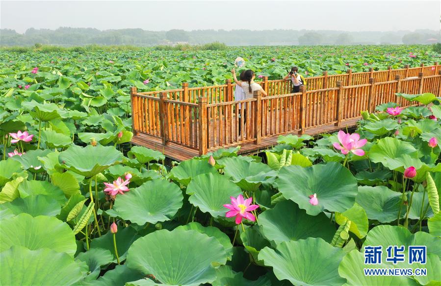 7月7日,游客在唐山市南湖公園的觀荷棧橋上拍照(無人機(jī)照片)。近日,河北省唐山市南湖公園內(nèi)荷花競相綻放,呈現(xiàn)出“接天蓮葉無窮碧,映日荷花別樣紅”的美麗景象,吸引了眾多游客前來觀賞。新華社記者楊世堯攝