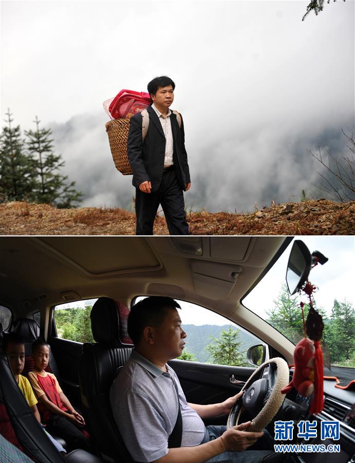 這是一張拼版照片,上圖:在廣西龍勝龍脊鎮(zhèn)江柳村,余啟貴老師背著背簍走在去學校的路上(2013年2月26日攝);下圖:在廣西龍勝龍脊鎮(zhèn)江柳村,余啟貴老師開著自己的汽車帶著學生去學校(7月7日攝)。新華社記者陸波岸攝