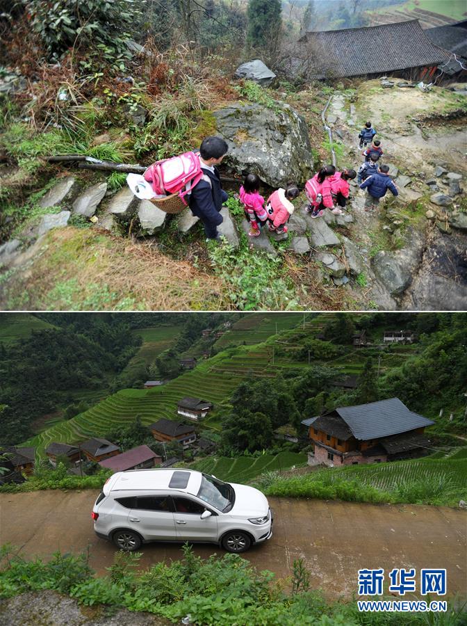 這是一張拼版照片,上圖:在廣西龍勝龍脊鎮(zhèn)江柳村,余啟貴老師背著背簍領(lǐng)著學(xué)生去學(xué)校(2013年2月26日攝);下圖:在廣西龍勝龍脊鎮(zhèn)江柳村,余啟貴老師開(kāi)著自己的汽車(chē)帶著學(xué)生去學(xué)校(7月7日攝)。新華社記者陸波岸攝
