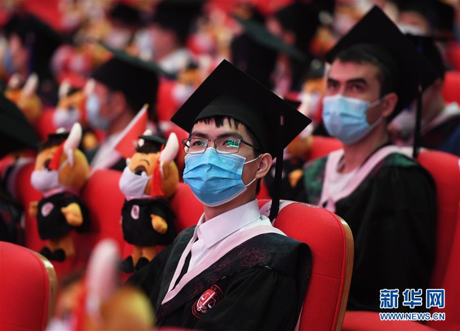 7月10日拍攝的中國(guó)政法大學(xué)2020屆畢業(yè)典禮現(xiàn)場(chǎng)。當(dāng)日,中國(guó)政法大學(xué)舉行2020屆畢業(yè)典禮。由于疫情防控需要,僅少量在校畢業(yè)生在中國(guó)政法大學(xué)昌平校區(qū)禮堂現(xiàn)場(chǎng)參加畢業(yè)典禮,更多畢業(yè)生通過線上直播參與。新華社記者任超攝
