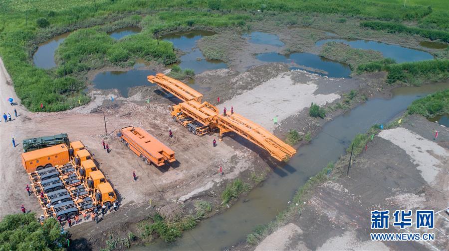 7月10日,工作人員在演練現(xiàn)場搭建機械化橋梁(無人機照片)。當日,由吉林省交通運輸廳主辦的公路橋梁水毀搶通應急演練在長春市雙陽區(qū)雙陽河舉行,參與演練人員從汛情水毀信息報送、應急裝備快速集結(jié)、機械化橋梁搶通搭設(shè)、善后處理等方面進行實戰(zhàn)演練。新華社記者張楠攝