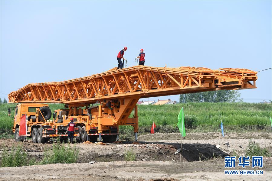 7月10日,工作人員在演練現(xiàn)場搭建機(jī)械化橋梁。當(dāng)日,由吉林省交通運(yùn)輸廳主辦的公路橋梁水毀搶通應(yīng)急演練在長春市雙陽區(qū)雙陽河舉行,參與演練人員從汛情水毀信息報送、應(yīng)急裝備快速集結(jié)、機(jī)械化橋梁搶通搭設(shè)、善后處理等方面進(jìn)行實戰(zhàn)演練。新華社記者張楠攝