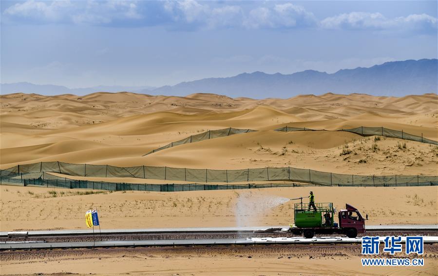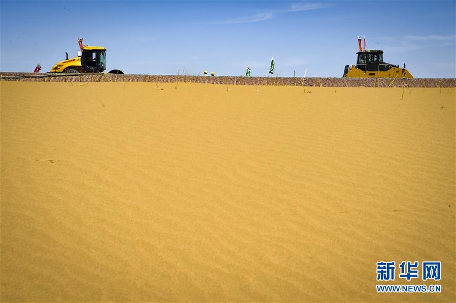 7月10日,工人在位于寧夏境內(nèi)的烏瑪高速青銅峽至中衛(wèi)段A9標段施工。盛夏時節(jié),位于寧夏境內(nèi)的烏瑪(內(nèi)蒙古烏海市至青?,斍呖h)高速青銅峽至中衛(wèi)段正在抓緊施工建設(shè)。該路段主線全長122.9公里,其中穿越騰格里沙漠腹地的18公里公路是寧夏建設(shè)的首條沙漠高速公路,預(yù)計2021年建成通車。新華社記者馮開華攝。