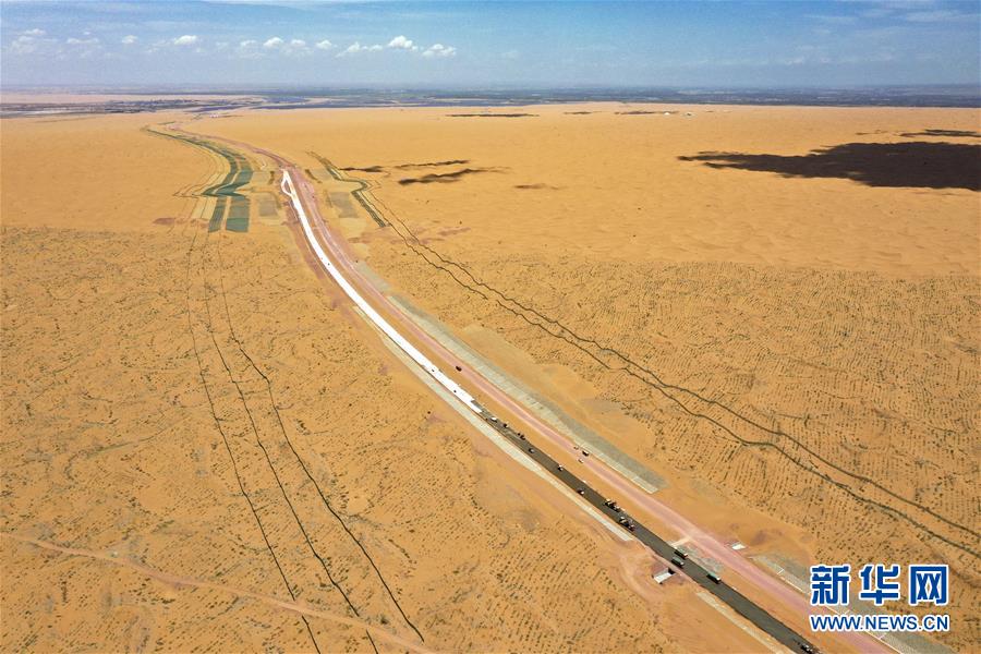烏瑪高速青銅峽至中衛(wèi)段穿越騰格里沙漠的18公里路段,與中國首條沙漠鐵路——包蘭鐵路交匯(7月10日攝,無人機照片)。盛夏時節(jié),位于寧夏境內(nèi)的烏瑪(內(nèi)蒙古烏海市至青?,斍呖h)高速青銅峽至中衛(wèi)段正在抓緊施工建設(shè)。該路段主線全長122.9公里,其中穿越騰格里沙漠腹地的18公里公路是寧夏建設(shè)的首條沙漠高速公路,預(yù)計2021年建成通車。新華社記者馮開華攝。