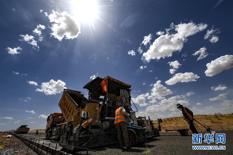 7月10日,工人在位于寧夏境內(nèi)的烏瑪高速青銅峽至中衛(wèi)段A10標(biāo)段施工。盛夏時(shí)節(jié),位于寧夏境內(nèi)的烏瑪(內(nèi)蒙古烏海市至青?,斍呖h)高速青銅峽至中衛(wèi)段正在抓緊施工建設(shè)。該路段主線全長(zhǎng)122.9公里,其中穿越騰格里沙漠腹地的18公里公路是寧夏建設(shè)的首條沙漠高速公路,預(yù)計(jì)2021年建成通車。新華社記者馮開(kāi)華攝。