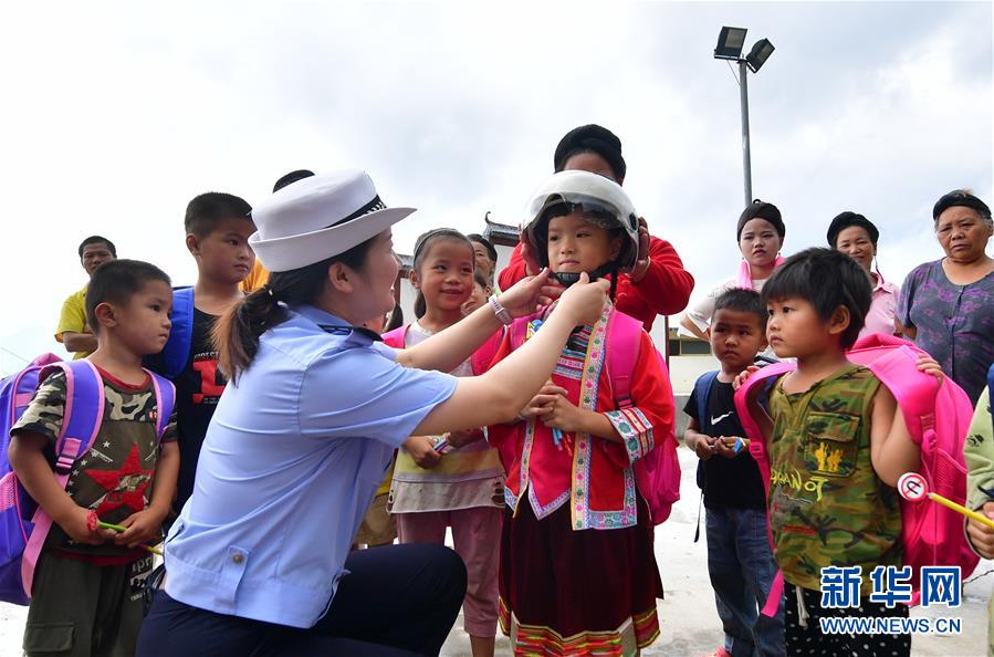 7月11日,柳州市交警支隊民警指導(dǎo)小朋友正確佩戴頭盔。當(dāng)日,廣西柳州市交警支隊的民警來到融水苗族自治縣大浪鎮(zhèn)大新村紅鄧屯教學(xué)點(diǎn),開展暑期交通安全教育活動,增強(qiáng)孩子們的安全出行意識。新華社記者黃孝邦攝