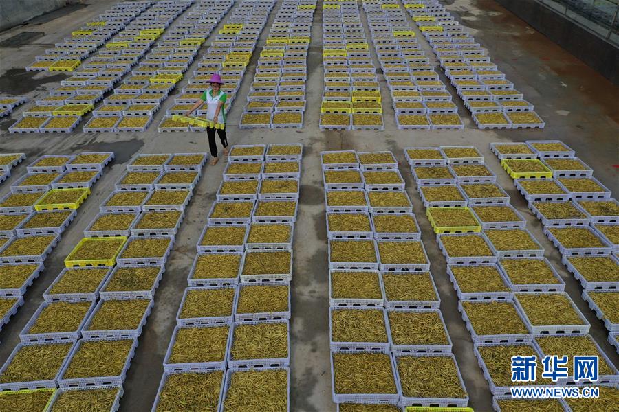 7月12日,祁東縣黃土鋪鎮(zhèn)雁隆食品公司內(nèi),工人在晾曬黃花菜(無人機照片)。新華社記者 趙眾志 攝