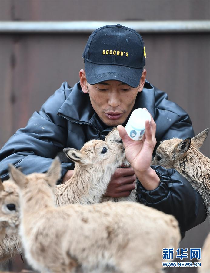 7月7日,三江源國家公園管理局長江源園區(qū)可可西里管理處卓乃湖保護(hù)站的工作人員才文多杰在給藏羚羊幼仔喂奶。新華社記者 薛玉斌 攝