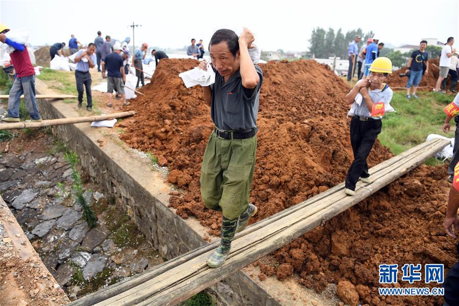 7月14日,當?shù)卮迕裢簧习徇\砂石袋。近日,受洪水影響,安徽省望江縣華陽鎮(zhèn)境內(nèi)的江調圩內(nèi)部道路漫水,搶險車輛無法進入。當?shù)胤姥床块T組織船只裝載砂石袋等防汛物資,運往圩堤保防汛。新華社記者 劉軍喜 攝