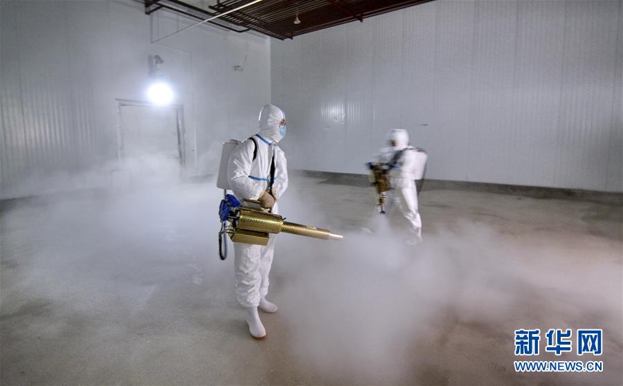 7月14日,北京二商肉類食品集團(tuán)有限公司員工對(duì)肉類冷藏庫房進(jìn)行全方位消毒。北京二商肉類食品集團(tuán)有限公司是保障北京肉類市場(chǎng)供應(yīng)的主要企業(yè)之一。新冠肺炎疫情以來,企業(yè)嚴(yán)格實(shí)施北京市、農(nóng)業(yè)農(nóng)村部和中國(guó)肉類協(xié)會(huì)的防疫要求,對(duì)進(jìn)入廠區(qū)的人員、車輛以及原料采購(gòu)、屠宰分割、產(chǎn)品加工、貯藏運(yùn)輸、廢棄物收集及污水處理等生產(chǎn)環(huán)節(jié)嚴(yán)格防疫,強(qiáng)調(diào)源頭把關(guān)徹底消毒。目前,集團(tuán)公司下屬多家生豬屠宰加工基地正常運(yùn)營(yíng),保質(zhì)保量供應(yīng)北京市場(chǎng)需求。新華社記者 李欣 攝