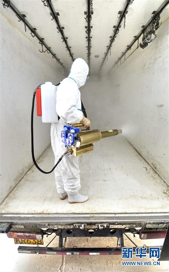 7月15日,北京二商肉類食品集團(tuán)有限公司員工對(duì)冷鏈運(yùn)輸設(shè)備進(jìn)行消毒。北京二商肉類食品集團(tuán)有限公司是保障北京肉類市場(chǎng)供應(yīng)的主要企業(yè)之一。新冠肺炎疫情以來(lái),企業(yè)嚴(yán)格實(shí)施北京市、農(nóng)業(yè)農(nóng)村部和中國(guó)肉類協(xié)會(huì)的防疫要求,對(duì)進(jìn)入廠區(qū)的人員、車輛以及原料采購(gòu)、屠宰分割、產(chǎn)品加工、貯藏運(yùn)輸、廢棄物收集及污水處理等生產(chǎn)環(huán)節(jié)嚴(yán)格防疫,強(qiáng)調(diào)源頭把關(guān)徹底消毒。目前,集團(tuán)公司下屬多家生豬屠宰加工基地正常運(yùn)營(yíng),保質(zhì)保量供應(yīng)北京市場(chǎng)需求。新華社記者 李欣 攝