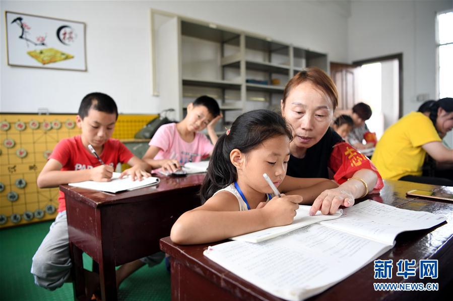 7月16日,在安徽省宿松縣洲頭鄉(xiāng)中心小學(xué)集中安置點(diǎn),教師志愿者輔導(dǎo)孩子們完成暑假作業(yè)。