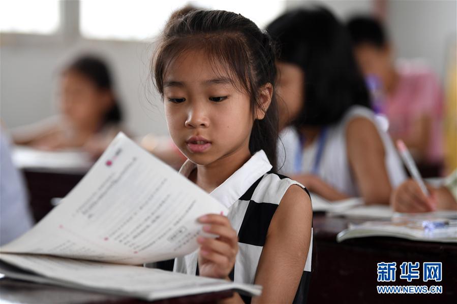 7月16日,在安徽省宿松縣洲頭鄉(xiāng)中心小學(xué)集中安置點(diǎn),小朋友在做暑假作業(yè)。新華社記者劉軍喜攝