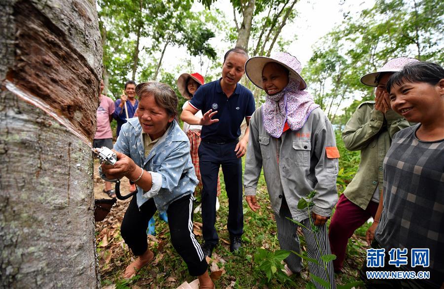 7月15日,瓊中縣什運鄉(xiāng)便文村貧困戶在技術(shù)人員指導(dǎo)下試用電動割膠刀。當(dāng)日,海南瓊中黎族苗族自治縣什運鄉(xiāng)為542名貧困戶免費發(fā)放電動割膠刀,割膠刀研發(fā)單位為貧困戶提供使用技能培訓(xùn)。海南有著豐富的天然橡膠資源,但傳統(tǒng)膠刀的割膠技術(shù)要求高,農(nóng)民難以掌握,許多膠林閑置。電動割膠刀使割膠簡單易學(xué),幫助村民提高割膠效率,助力脫貧增收。新華社記者郭程攝