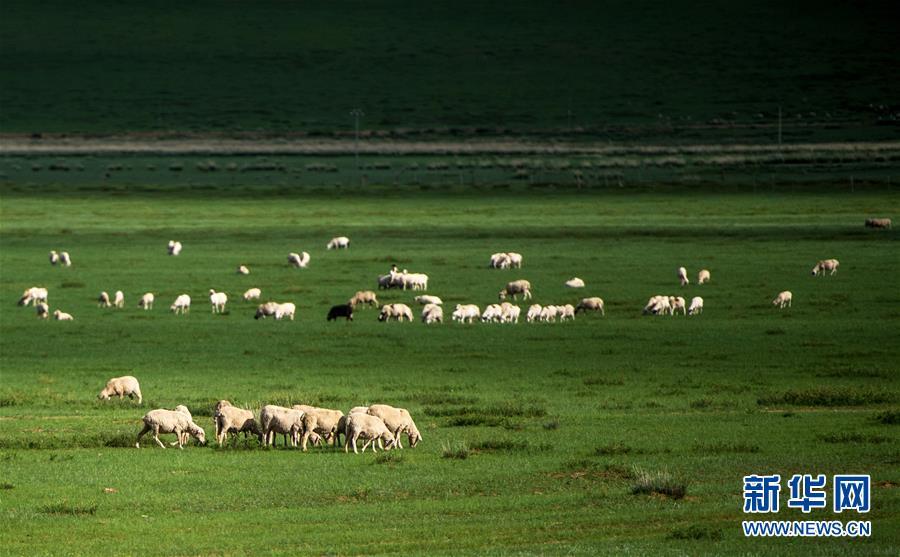 7月18日,羊群在內(nèi)蒙古錫林郭勒盟正鑲白旗境內(nèi)的草原上覓食。連日來(lái),內(nèi)蒙古錫林郭勒盟迎來(lái)多次降雨,境內(nèi)廣袤的草原經(jīng)過雨水的滋潤(rùn),煥發(fā)出勃勃生機(jī)。新華社記者連振攝
