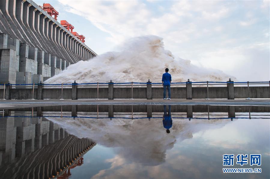 7月19日,工作人員在三峽樞紐前巡查。19日20時(shí),三峽水庫入庫流量4.6萬立方米/秒,較本輪洪水的峰值6.1萬立方米/秒下降了1.5萬立方米/秒。“長江2020年第2號洪水”平穩(wěn)通過三峽大壩。新華社記者肖藝九攝