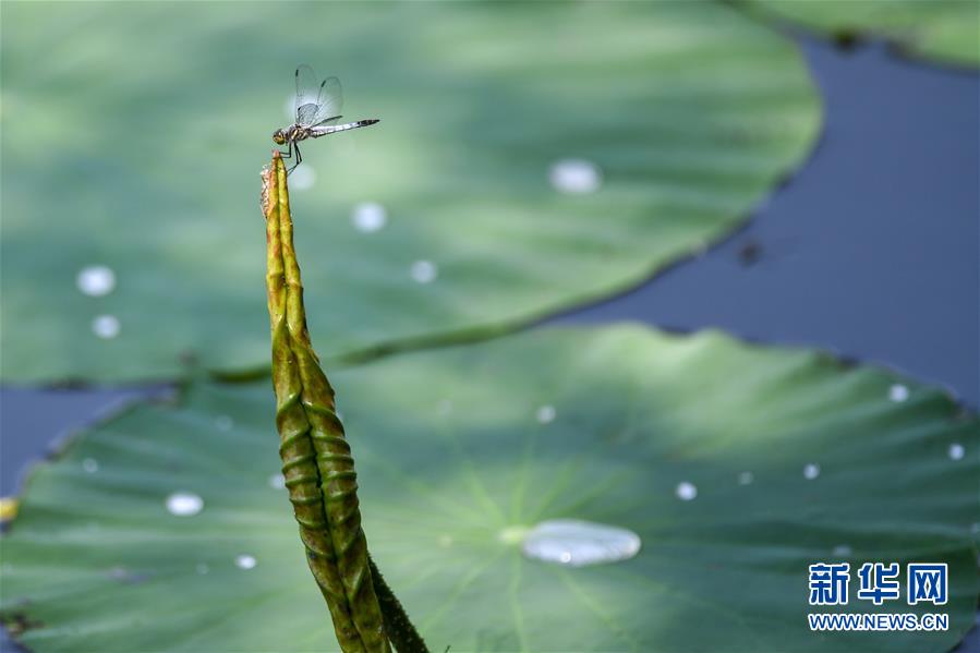 在吉林長春南湖公園,一只蜻蜓在荷葉上停歇(7月16日攝)。新華社記者張楠攝