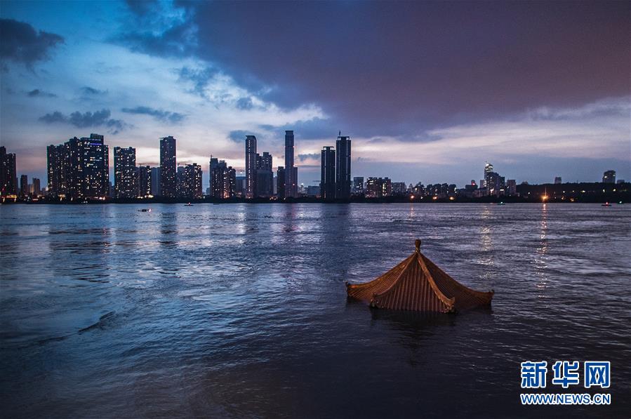上漲的江水即將淹沒武昌黃花磯涼亭(7月13日攝)。7月13日17時(shí),長江干流漢口站水位達(dá)28.74米,較之前的洪峰水位28.77米出現(xiàn)輕微下降。長江中下游洪水洪峰順利通過漢口江段。新華社記者肖藝九攝