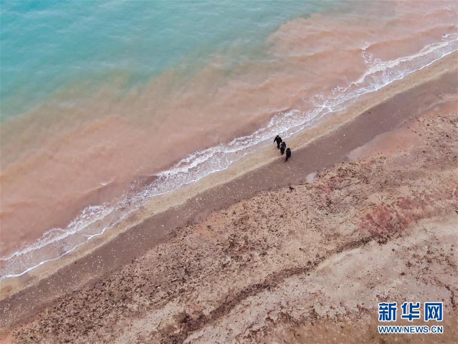 在可可西里索南達杰保護站管護區(qū)域內的湖泊附近,龍周才加(中)與隊友才仁多杰(左)、王文豪在巡視(6月30日攝,無人機照片)。新華社記者張龍攝