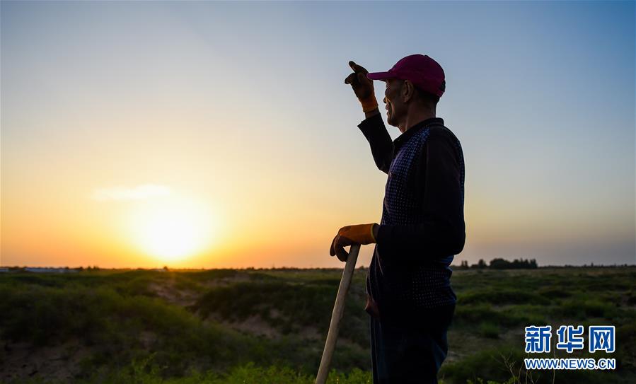7月7日,孟和巴依爾站在改造后的荒灘上,遠(yuǎn)望騰格里沙漠。1993年,孟和巴依爾看到家鄉(xiāng)內(nèi)蒙古阿拉善盟阿拉善左旗超格圖呼熱蘇木由于過(guò)度放牧,草場(chǎng)嚴(yán)重退化,于是,他與家人在家鄉(xiāng)承包了4000多畝草場(chǎng)進(jìn)行治沙造林。27年過(guò)去,孟和巴依爾一家承包的草場(chǎng)已從曾經(jīng)生態(tài)脆弱的沙化土地變成了如今的茵茵綠洲。新華社記者連振攝