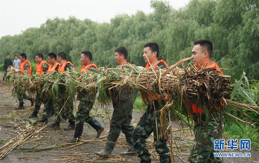 在鎮(zhèn)江市丹徒區(qū)世業(yè)鎮(zhèn)先鋒村西南大堤,中國安能集團(tuán)第二工程局常州分公司防汛前置備勤隊(duì)員準(zhǔn)備將捆好的蘆葦放在江堤邊(7月17日攝)。捆蘆葦護(hù)邊坡、機(jī)器人進(jìn)涵洞、“養(yǎng)水盆”防滲漏……在江蘇鎮(zhèn)江,當(dāng)?shù)馗刹咳罕姾蛯I(yè)力量,因地制宜就地取材,老辦法搭配新技術(shù),一批險(xiǎn)情得以消除在萌芽狀態(tài)。新華社記者季春鵬攝