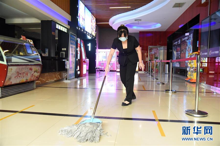 7月20日,濟南新世紀電影城陽光100店的員工在對影院設施進行消殺。當日,山東濟南市部分電影院在嚴格防控疫情的基礎上陸續(xù)恢復開放。新華社記者王凱攝
